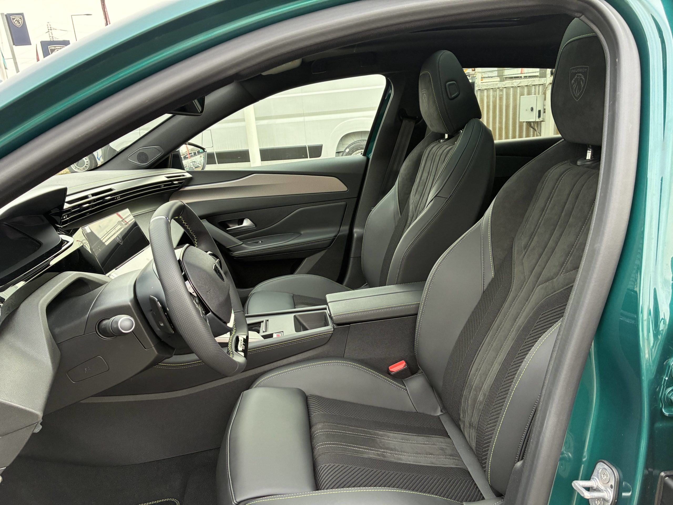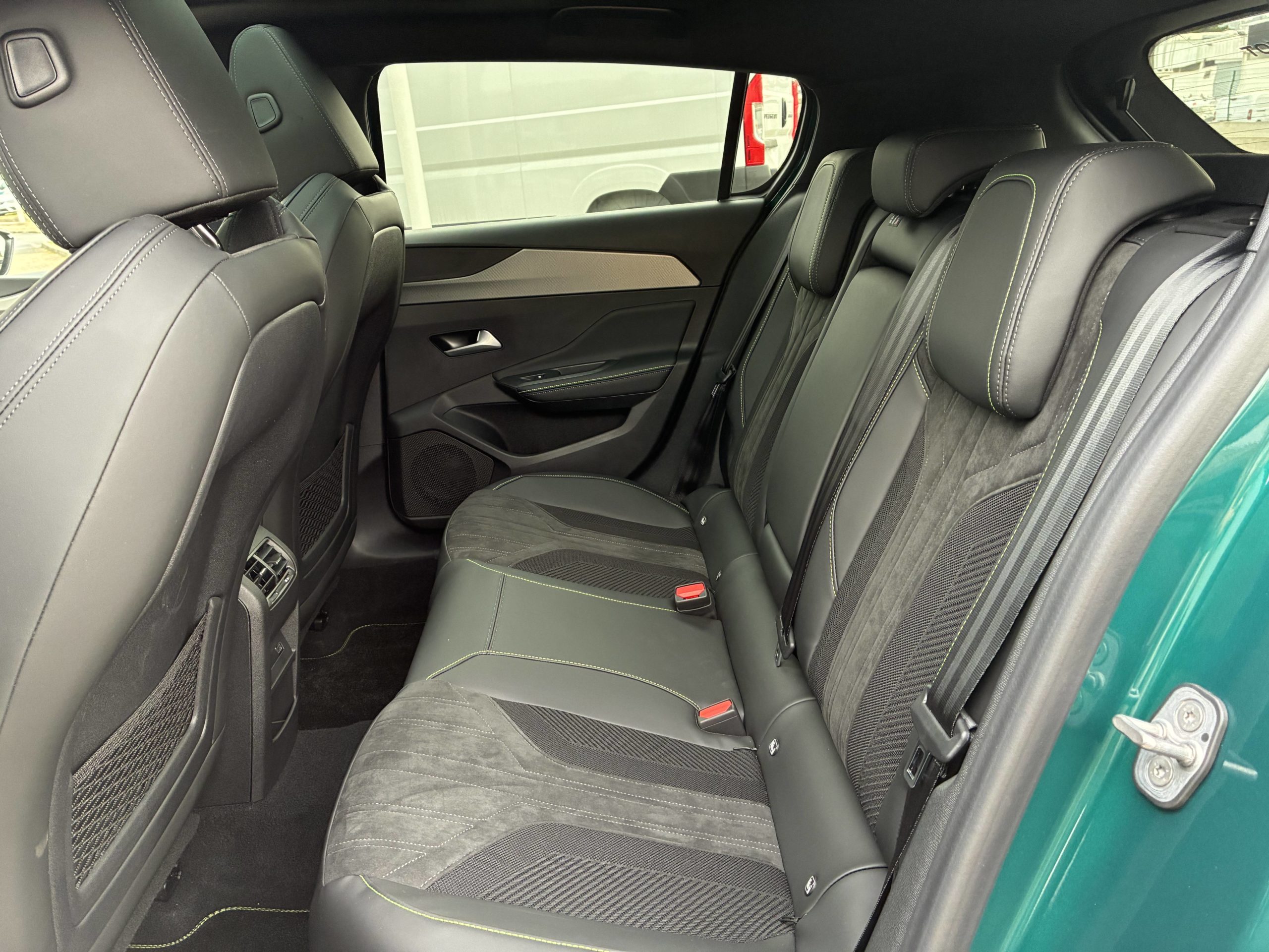 - Intérieur Alcantara Executive – Sellerie Alcantara Noir, tri-matières avec accompagnement TEP et surpiqûres vert Adamite – Siège conducteur AGR à réglages électriques, massant, chauffant – Siège passager AV à réglages manuels, avec réglage en hauteur de l’assise et lombaire pneumatique, massant, chauffant – Volant chauffant