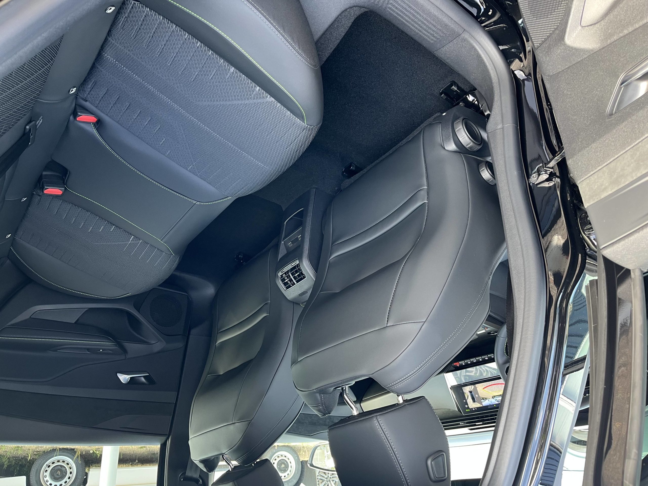 - Sellerie tissu noir UZILA embossé, tri-matières avec accompagnement TEP Isabella Mistral, doubles surpiqûres vert Adamite / gris Tramontane, et blason PEUGEOT sur appuie-têtes AV
